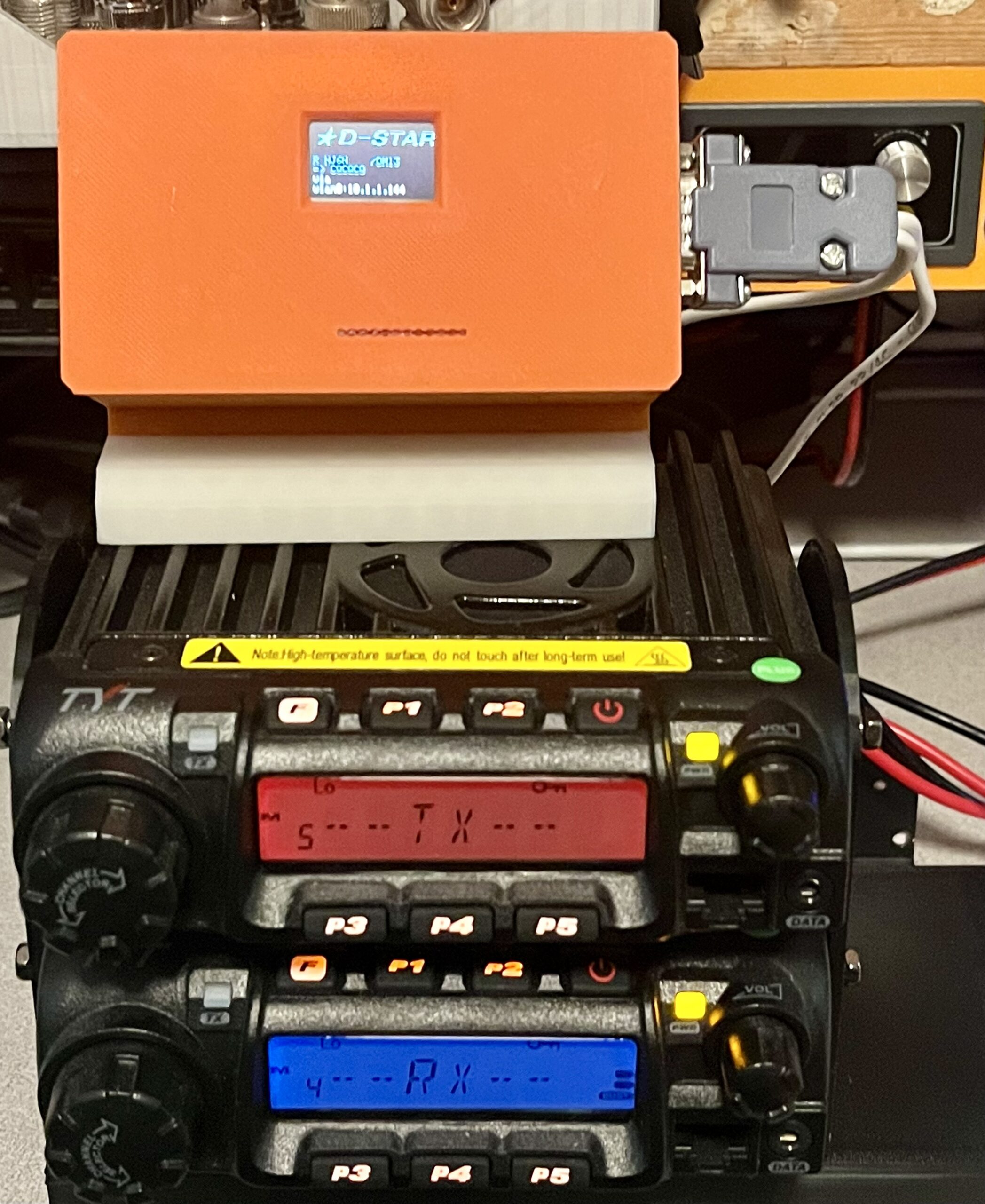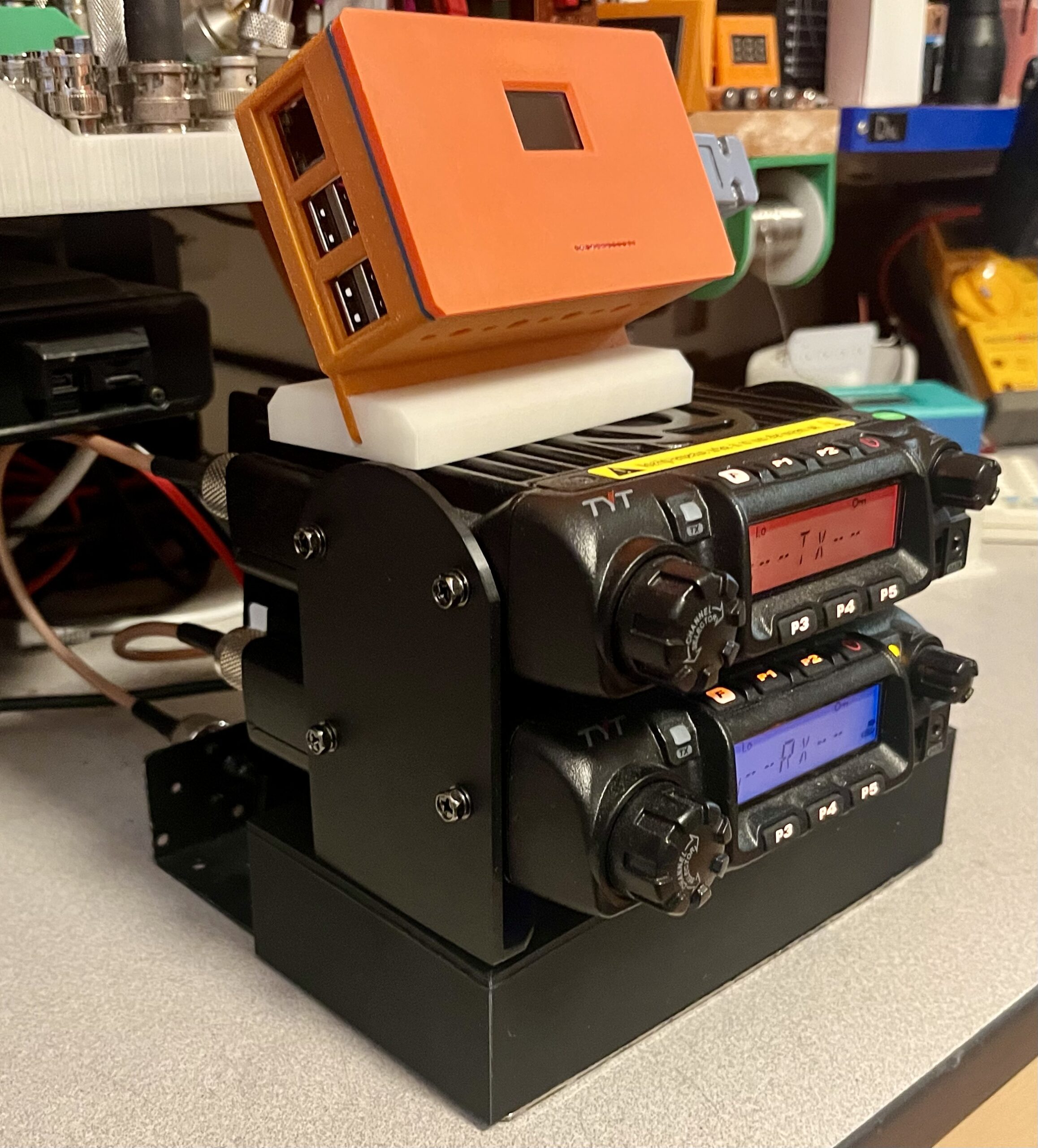 I designed a mounting bracket for the two radios to keep the installation tidy. The transmitter is mounted on top. I also designed a fan bracket for the transmitter. If I run this repeater at 50 watts, it will need additional mechanical cooling.
